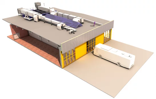 Die Kranbahn ist speziell für das sichere Handling der Dachkomponenten von Wasserstoffbussen konzipiert, insbesondere für H₂‑Tanks und Brennstoffzellen. Die Krananlage wird so angeordnet, dass der gesamte Busbereich abgedeckt ist. Ein besonderer Fokus liegt auf der Torseite der Halle: Hier können die Bauteile bevorzugt sicher zu Boden gelassen oder von dort aufgenommen werden, was kurze Wege und effiziente Arbeitsabläufe ermöglicht.
