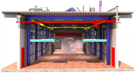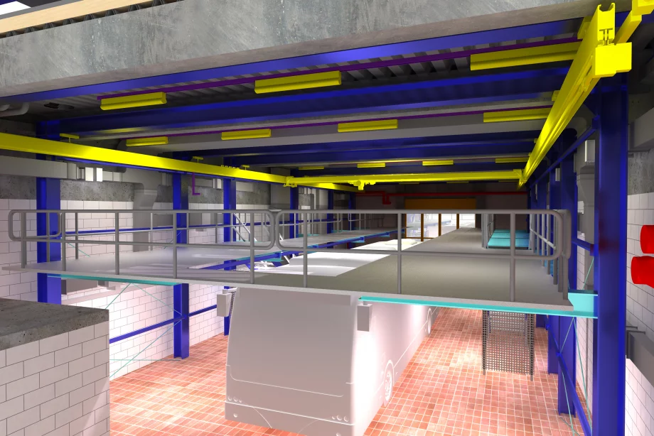 Auf Wunsch der Rheinbahn sollte die vorhandene Hallenspur weitgehend erhalten bleiben. Die neue Technik sowie die komplexe Lüftungsanlage wurden daher in die bestehende Kubatur integriert. Mithilfe einer modernisierten 3D‑Planung konnten potenzielle Kollisionen frühzeitig erkannt und bereits in der Planungsphase gelöst werden. Dies erhöhte die Planungssicherheit und trug zu einem reibungslosen Ablauf der Ausführung bei.