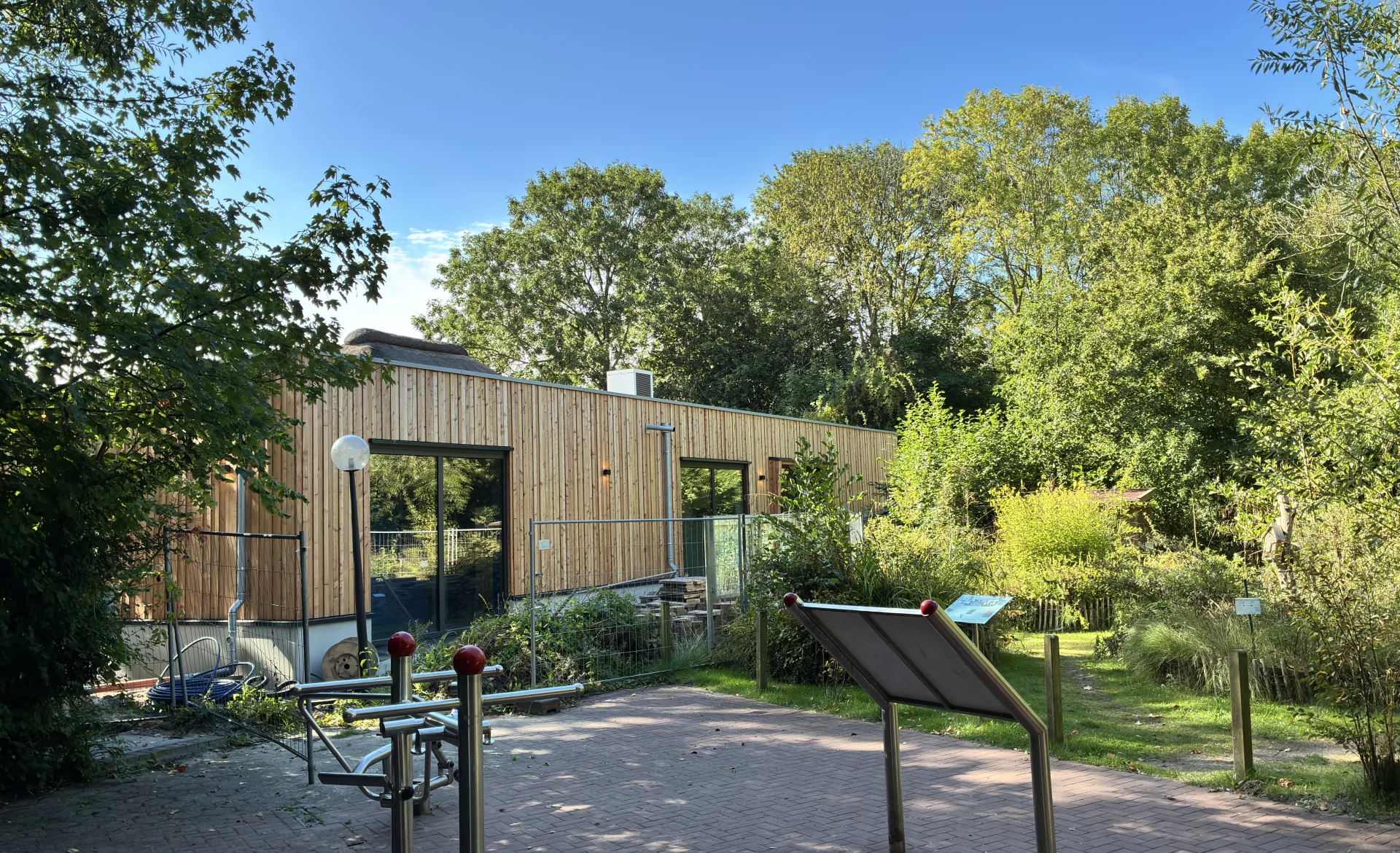 Architektonisch verbindet das Gebäude natürliche Materialien mit einer klaren, zeitgemäßen Formensprache. Die überwiegend mit Holz verkleidete Fassade fügt sich harmonisch in die umgebende Landschaft ein. Das Reetdach verleiht dem Gebäude einen regionaltypischen Charakter und unterstreicht zugleich den nachhaltigen Anspruch des Projekts.