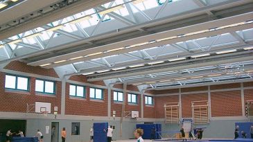 In der Dreifach-Sporthalle der Helene-Lange-Schule in Oldenburg bestand die Aufgabe darin, ein Tragwerk zu entwickeln, welches eine sehr lichtdurchflutete Halle gewährleisten sollte, ohne dabei höher zu werden als üblich. Es entstand ein besonderes Stahltragwerk mit Lichtbändern über den Hauptbindern.